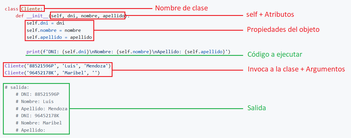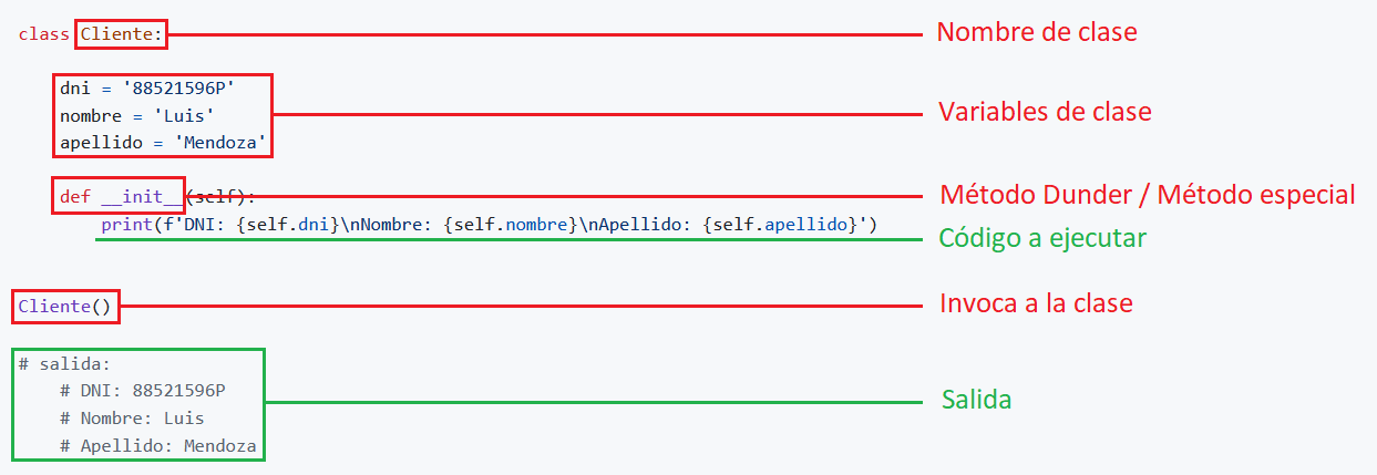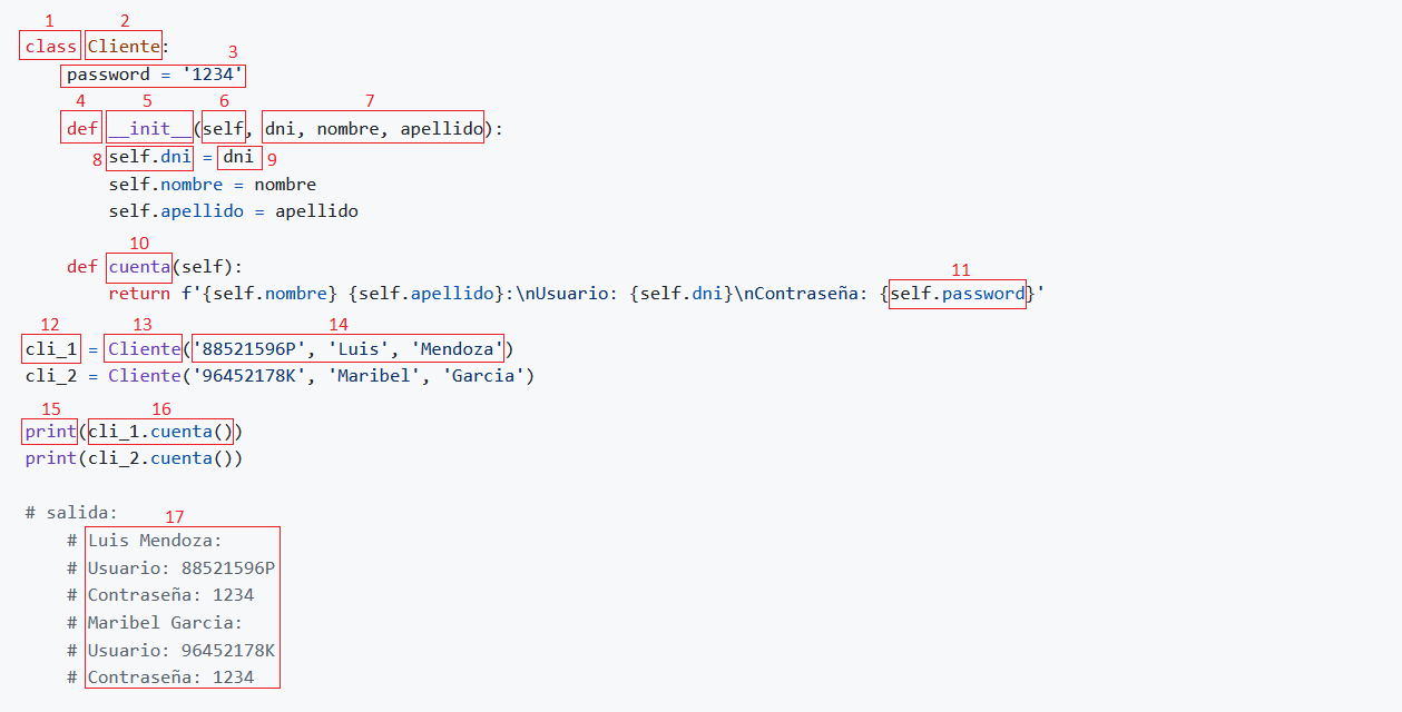 classDeclara una clase.ClienteAsigna un nombre a la clase, siempre en PascalCase y sin guiones bajos.password = '1234'Declara una variable de clase.defDeclara un método.__init__Lleva dos guiones al principio y al final del nombre, se le conoce como método dunder, especial o mágico.selfEs el primer atributo obligatorio siempre.dni,nombre,apellidoSe llaman atributos del método y van separados por una,coma.self.dniDeclara una variable de instancia.dniGuarda el valor de la variable de instancia.cuentaAsigna un nombre al método.self.passwordHace referencia a la variable de instancia para retornar su valor.cli_1Crea un objeto.ClienteInvoca a la clase desde cualquier parte de la aplicación.'88521596P','Luis','Mendoza'Se llaman argumentos.PrintEs una función para imprimir en pantalla.cli_1.cuentahace referencia al objetocli_1para acceder a la clase y ejecutar el métodocuenta.- Visualizamos los datos en la pantalla.