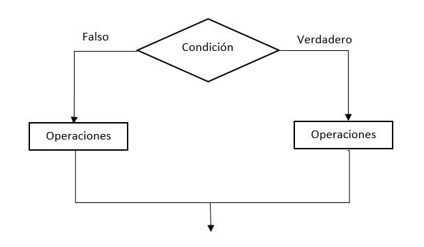 Podemos observar en el esquema que el rombo representa la condición y tenemos dos opciones que podemos tomar. Si la condición devuelve un resultado verdadero, ejecutará las opciones que se encuentren en su interior, si por el contrario es falso, no realizará dicha acción.