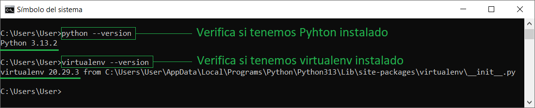 01. Verifica si Python y virtualenv están instalados de forma global y si no aparecen, instalalos.