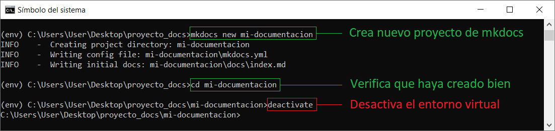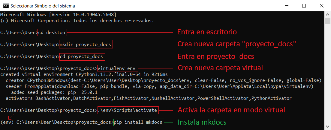05. Instala la librería dentro de la carpeta “env” con el comando (pip install mkdocs).