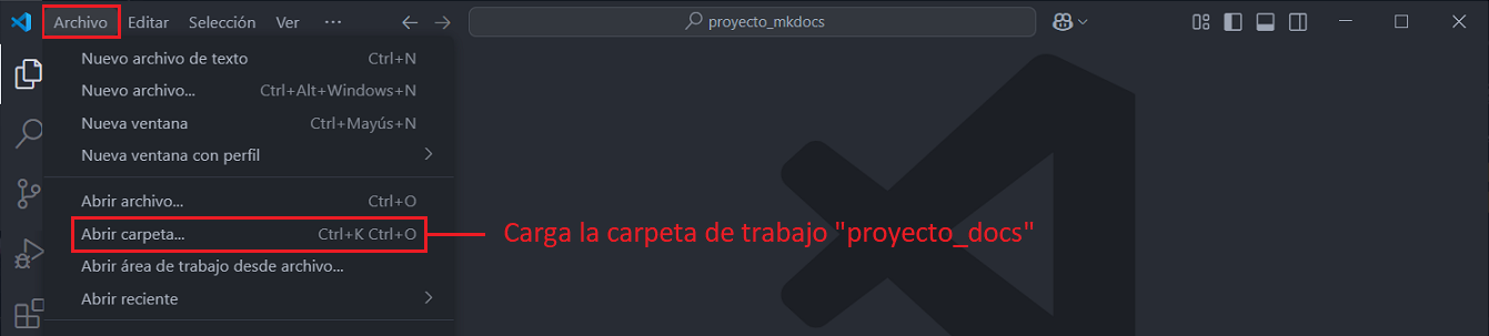09. Abre VSCode y carga la carpeta del escritorio “proyecto-docs” desde el menu superior (Archivo / Abrir carpeta…).