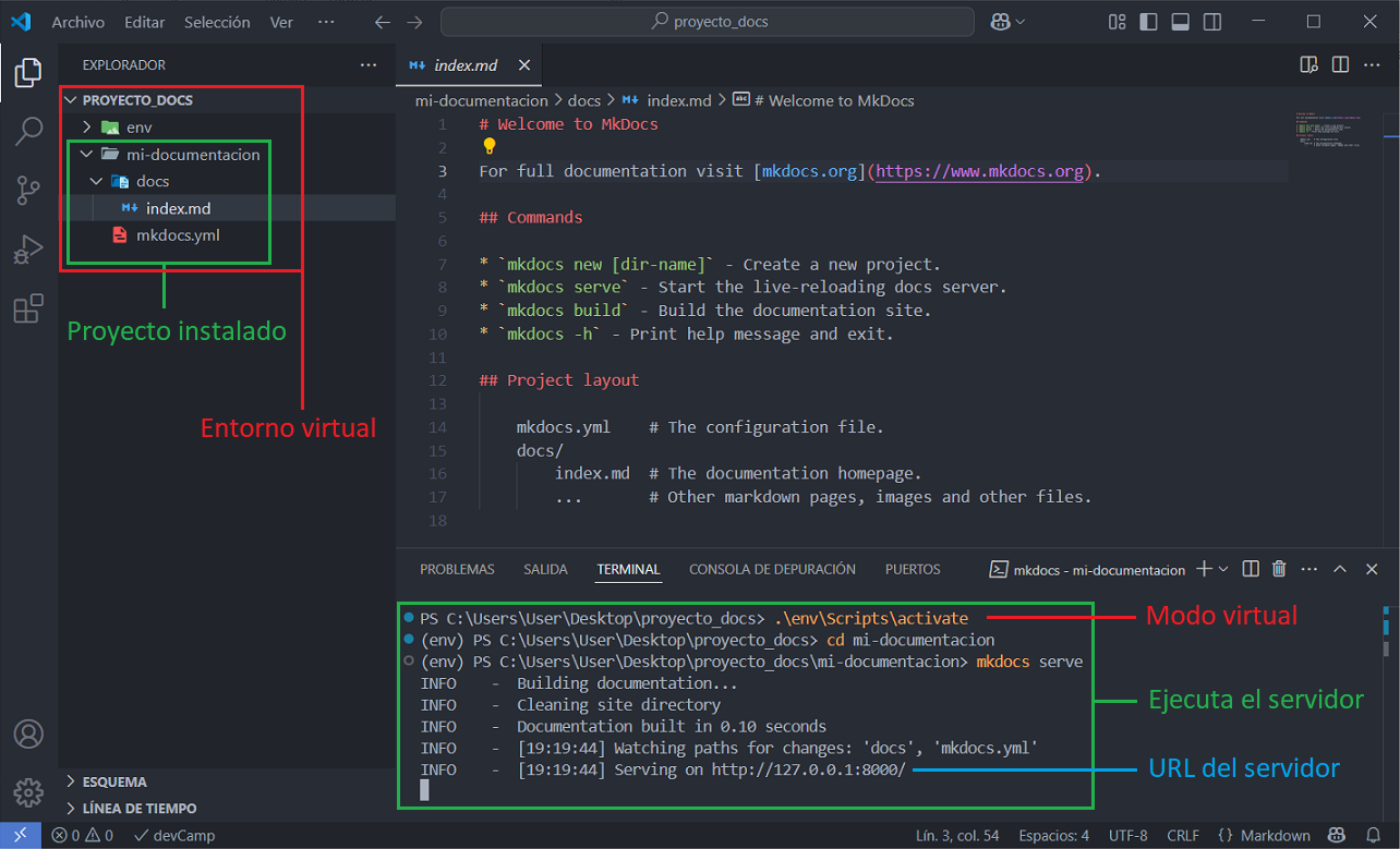 Instalar MkDocs con Python y virtualenv