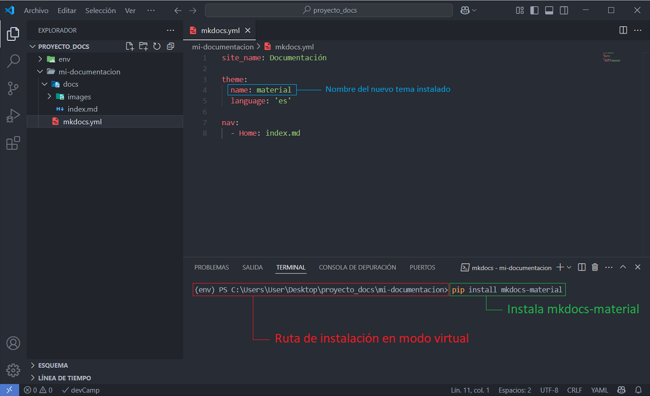14. Ahora que ya tenemos mkdocs en marcha, toca instalar un tema desarrollado para mkdocs que le va dar un diseño mucho mas moderno. Abre la terminal de VSCode, pulsa (ctrl + c) para detener el servidor, activa el entorno virtual, accede a la carpeta “mi-documentación” y desde ahí ejecuta el comando (pip install mkdocs-material). Una vez terminada la instalación, abre el archivo “mkdocs.yml” y modifica el nombre del tema. En este caso, se llama material. El tema que viene instalado por defecto se llama “readthedocs”.